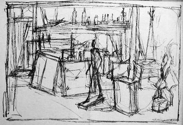 Above: A studio drawing by Alberto Giacometti. Without being in any way overwhelmed by Giacometti’s achievement, we can use this drawing to get us looking at scale, at spatial relationships between objects, and busy versus quiet areas within a composition.
