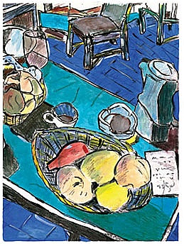 For example, Bob Dylan included six differently-coloured versions of his “Still life with peaches” in his “Drawn Blank” series, my favourite of which is shown above. Others were coloured in earthy or warm brown-orange tones. The use of colour changes the emphasis within the composition, and also gives each image its own emotional “punch”.