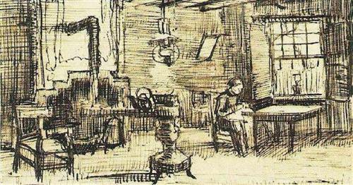 - Where is the light coming from? Note the position of any sources of light such as window(s), open doorway, lamp(s). Out of all of these, there may perhaps be one main light source. E.g. in Van Gogh’s “Interior with woman sewing”, the light is coming from the upper right side of the picture, with shadows falling to the left of the objects. There is light coming from the window next to the sewing woman, but the fall of the shadows suggests that there is another bright window or open doorway in the far right, not included in the picture.
