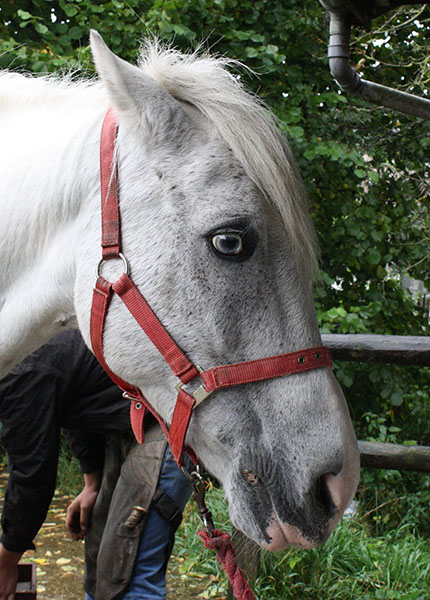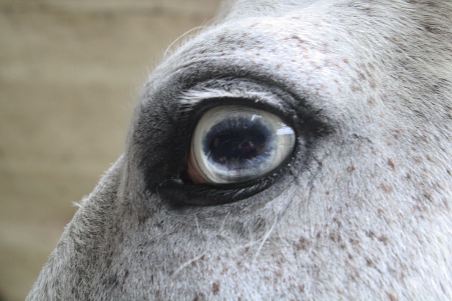 Max has blue eyes with beautiful black pigment around the lids. I took the photo just as the blacksmith started to work on him so he was, perhaps, a little apprehensive. However, it is the pale eyes and the dark “eyeliner” that gives this image a startled look. The upper lid is slightly raised, with a little creasing of the eyebrow above, but this is not a horse who is panicking. The true white of the eye is not visible at all. What we are seeing is the pale blue iris.