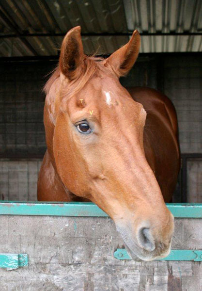 The above effects are more prominent in certain breeds of horses ,e.g. Thoroughbreds, who naturally have more muscle tone around their eyes even when they are relaxed. Below is the handsome head of Ted, which I have included here as it illustrates the upside-down V eyebrow. This photo shows him having just been put in a box on an unfamiliar yard so he is feeling a little apprehensive. Ted’s breeding and lean conformation make those peaked eyebrows really stand out. I have labelled the eyebrow, “V”, and the deep temporal fossa, “T”. You may wish to click on the image to better view the labelling and detail: