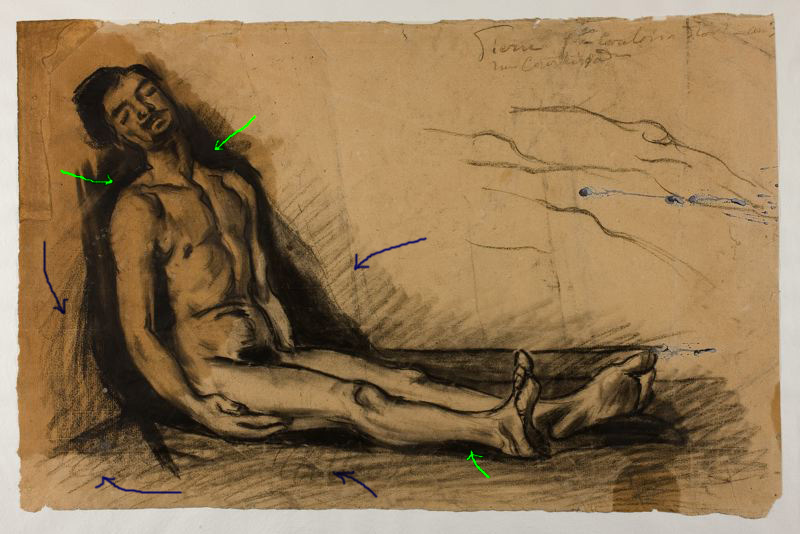 Shadows cast by an object can really help to explain where that object is positioned within the picture. For example, look again at the inky black shadows in Cezanne’s “l’autopsie” study, (indicated by green arrows, below). They emphasise where the figure contacts the floor and how close he is to the vertical supporting surfaces on either side of him: