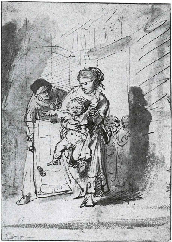 Above: Rembrandt “The Naughty Boy” c.1635, pen and bistre. Notice how the angled frontage of the building leads us to look at the struggling figures. The three main figures (the frantic child, the stressed mother and the old woman stooping towards them) are confined uncomfortably to the space delineated by the building and the shadows.