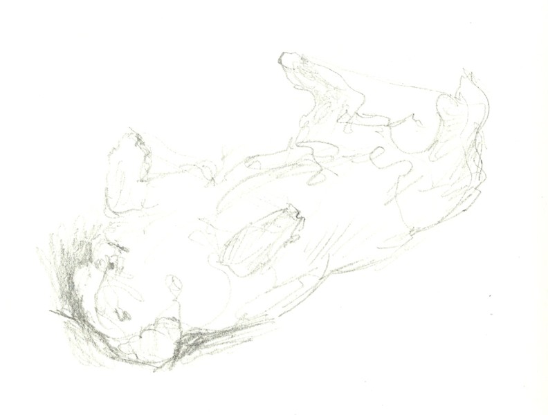 Does your dog lie in a funny position? In his old age, Freddy went through a phase of wanting to lie upside-down and would rest like that for a few minutes. This is a challenging pose to draw (watch out for all that foreshortening) and he tended to roll slowly back onto his side so I had to draw rapidly: