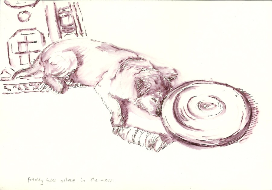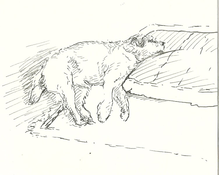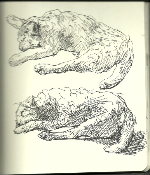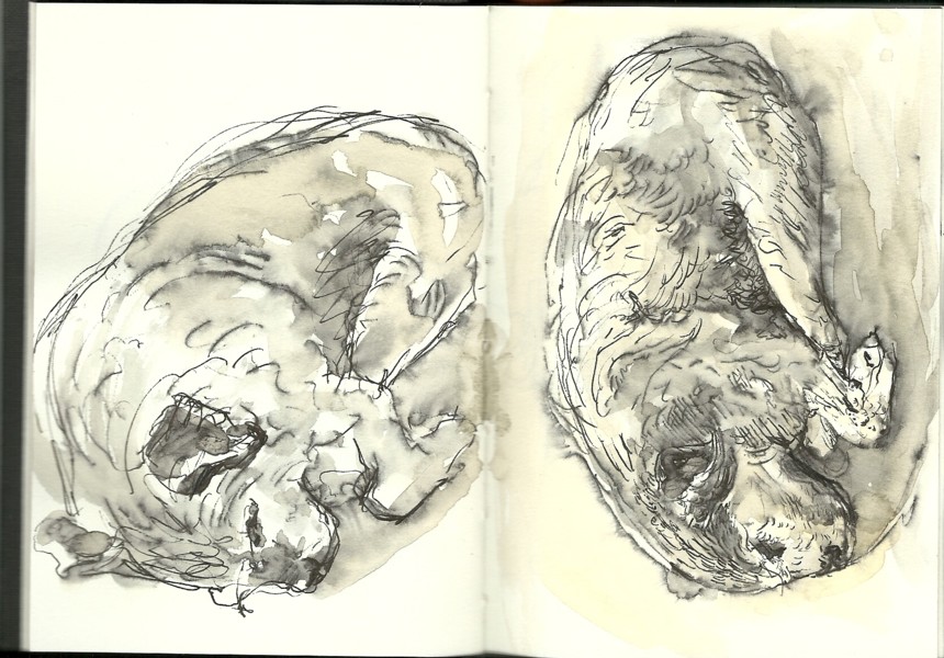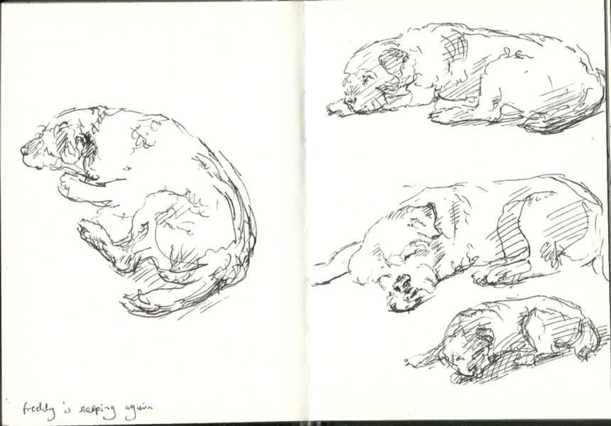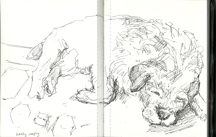 In the two sleeping poses above, I had time to build Freddy’s structure up with pen cross-hatching, and also to suggest his shaggy coat with pen strokes.