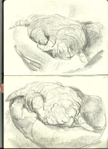 In the sketchbook below, I did a few scribbly drawings of Freddy moving about before he settled down for a sleep. The attempts to draw him in various fleeting postures adds a little character to the pictures of him sleeping.