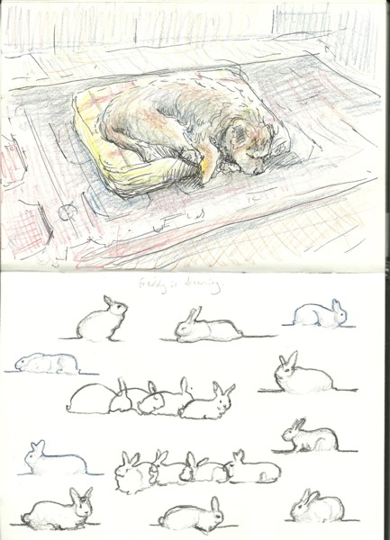 From time to time, you can even be a bit whimsical if you wish. In the double page spread, below, I drew Freddy sleeping yet again, but then imagined that he was dreaming of rabbits. He used to love to chase rabbits but never caught one: