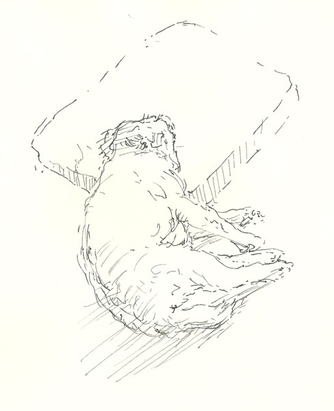 Here are three poses as seen almost from above as he changed sleeping position. He had long, shaggy fur over his back that parted in the midline. The shagginess could sometimes make it difficult to understand the actual structure of him and it is important not to fall into the trap of drawing every strand of hair. Sometimes the fur could be useful in my drawings, e.g. to help delineate where the middle of his back was positioned. Here I used the bulk of the fur to suggest his posture: