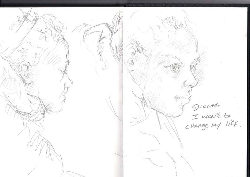 I eventually left the train with the uncomfortable feeling that I had failed this girl in some way. Yes, she’d asked for money and I had given her some of this (though not enough for a night’s stay at the YMCA). But as a fellow human being, and also as someone who’d looked closely at Dionne and drawn her, I wished that I’d had more to offer for the longterm, perhaps genuinely helpful advice or a good contact for her.