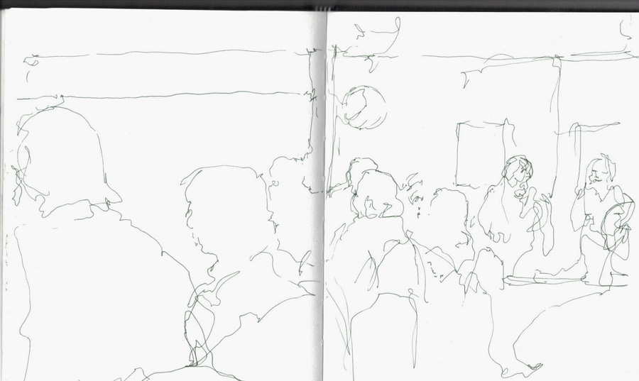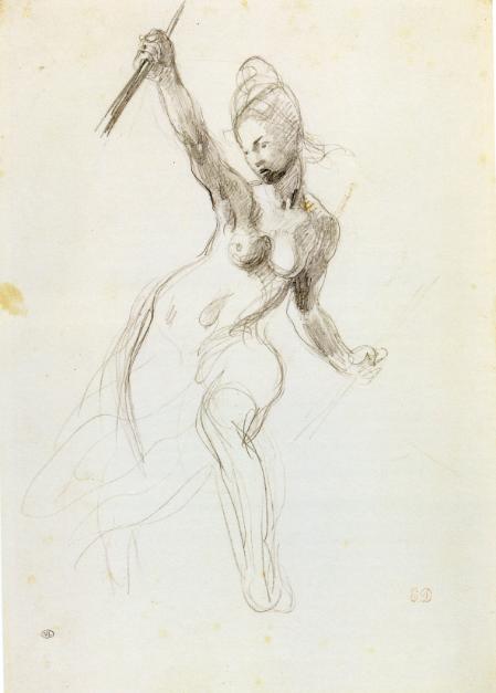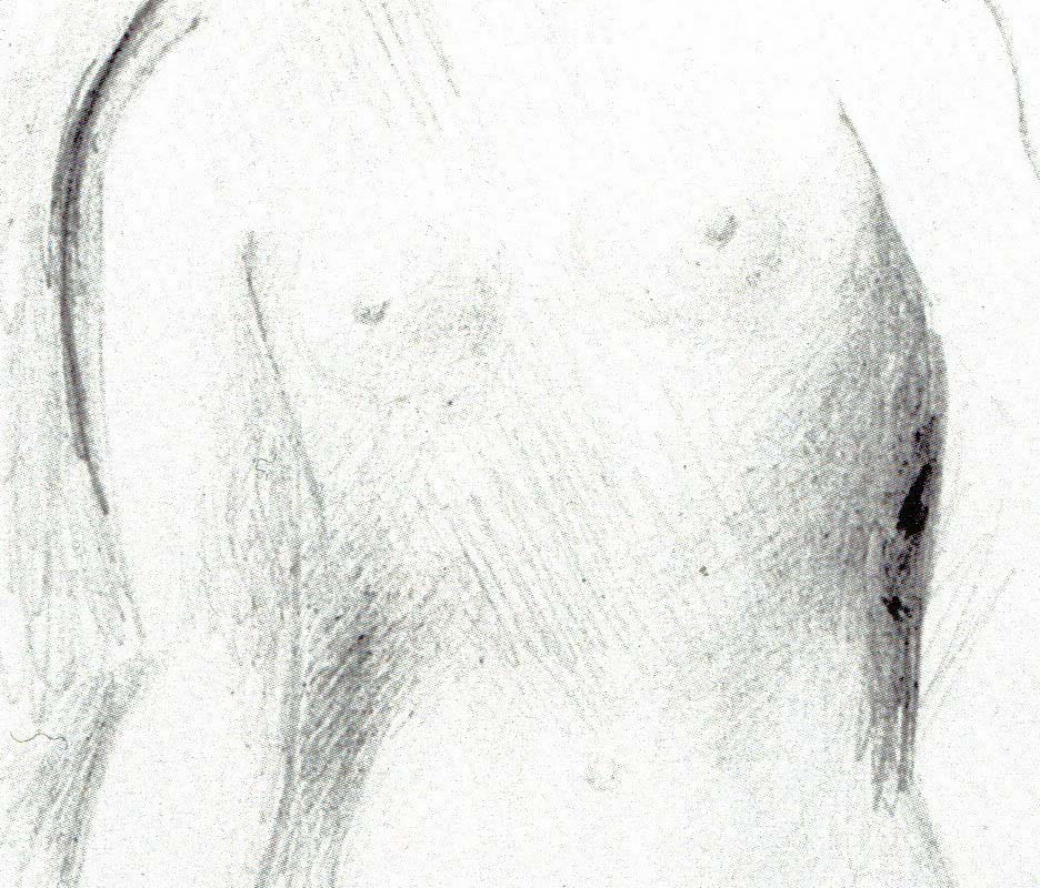 In the delicate sketchbook drawing, above and detail below, areas of hatching overlap the contour edge of the figure around the waist. Click on the images for a closer look. This is essentially a contour drawing (outline drawing). The hatching lines are used sparingly. They just hint at the figure’s form in one or two places, and suggest space in front of and around her. The image reminds me of a flickering memory, or of the idea of a ghost.