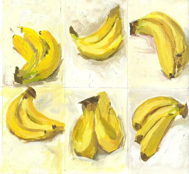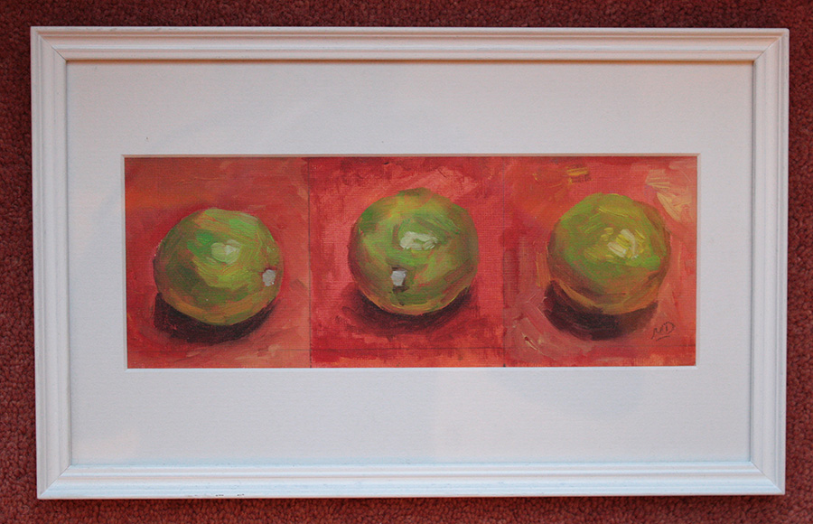 For example, where colour combinations were the initial interest, I could take the same colours in the same proportions as the original photo, and use them to create an oil painting or collage. Two-dimensional shapes could similarly inspire an abstract painting. Alternatively, I could choose to set up a still-life inspired by shapes, colours and/or tones in one of the original images.