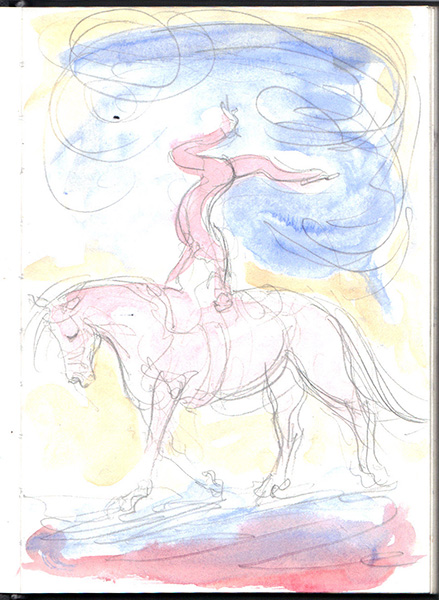 On trying to make sense of losing the dog in the first few days, the image in my “mind’s eye” no longer placed him in the real world in a logical fashion. Having previously done so many sketches of him lying on the floor, or next to a table, or resting in the garden, I could now no longer think of him and his surroundings as being predictable volumes. My visual understanding of the situation reminded me of Chagall paintings, with figures, trees, land and sky no longer connected in a real, three-dimensional sense but distorted and curled around one another, and with colours relating more to emotion than to the effect of light on the objects.