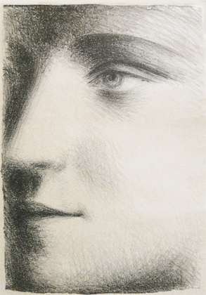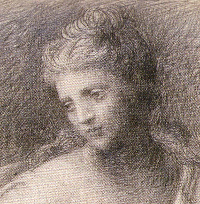 But there are additional meshes of vertical and diagonal lines descending from the top of the page and overlapping the woman’s hair. To me, this gives the effect of “something” being there between myself (the viewer) and the sitter. I don’t see an actual veil of fabric or falling rain between myself and the sitter, but the cross-hatched meshes do give a sense of space in front of her. Could they also give a sense of emotional distance between the viewer and the sitter? What do you think? Notice how the sitter’s eyes are not obscured by the cross-hatched mesh.