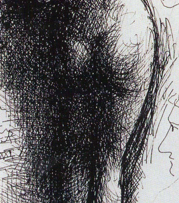 On the left side of Picasso’s figure, cross-hatching lines overlap the outline of her leg, ie. hatching lines continue from the figure into the background. This creates the melting shadow effect. I’ve shown some close-up detail, above, so that you can have a better look. Click on the image to enlarge it further.