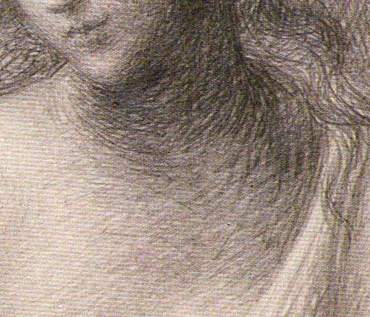 A magical, shimmering effect can be created by varying the direction of the cross-hatching lines. Blocks of lines can overlap. Lines may vary in strength and length. A good example is the area of background around the mother’s head, as seen below: