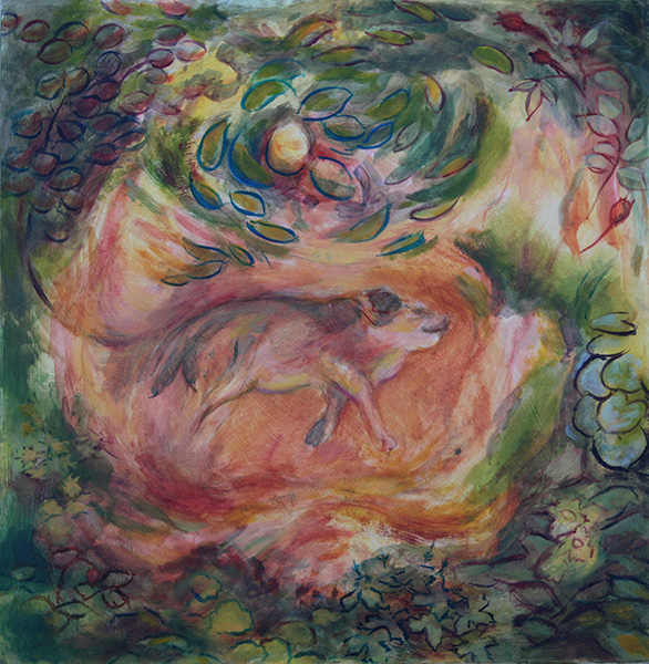 For my next picture, I have returned to the thought of a dog who has lived and died and who now has a place within the garden. Rather than attempting to show a static image of dead body, or a ghost, spirit or visible soul, I am aiming to keep this picture very ambiguous. I started the painting in a very “loose” manner, and have deliberately left it unclear as to whether the dog is remembered as alive or dead, resting or dying as seen from above, or perhaps even running as seen from the side. There is also ambiguity as to whether he is represented in a hole in the ground, resting on the surface of the land or, perhaps, hovering.