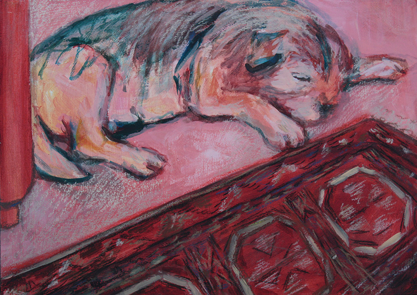 So it seemed that this picture had more to do with memory (mine) and identity (his, as seen by me) than to the physicality of death and burial. After picking up a second-hand copy of a book about Expressionism, I decided to make a “memory picture” of the dog in the house, perhaps suggesting the way in which an old dog seems to become part of the room and how, when gone, they leave a strange and awkward gap. This was based on an oil sketch made earlier in the year from life. Interestingly, I found myself drawn to using plenty of pinks in this image. There is currently a huge cultural push insisting that “pink is for a girl”. That is not why I used pink here. I liked the warmth of the colour, and the way in which I could flood the inside and the outside of the dog (the background floor) with the same pink.