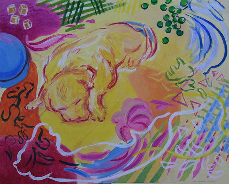 The dog in the above painting was copied from a pen drawing from one of my old sketchbooks. Inspired by Matisse, I felt free to use colours and patterns of my own choice around him. Some of the squiggly lines are copied from lively sketchbook drawings of my children. In the original sketches, these lines represented folds of clothing or bits of arms or legs. Other shapes hint at food treats or toys. I aimed to suggest a dog in a living room surrounded by mess and typical lively family chaos, but also enjoyed adding and overlaying shapes and patterns to balance one another in an abstract sense across this painting.