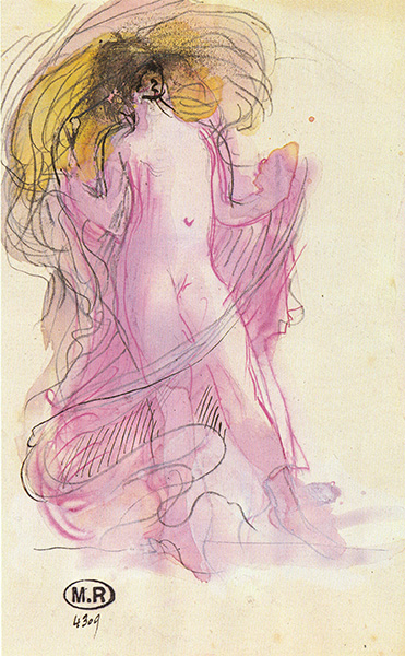 Above: Auguste Rodin “Woman with Swirling Veils”, c.1890, graphite, pen, red and brown ink and watercolour gouache, 17.5x11cm